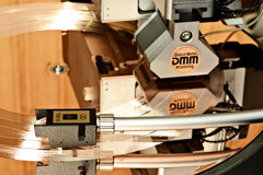 | 第一步是於電鍍銅片上進行直刻切割。音槽的紋理是由切割器材中複雜的電子與機械部件來決定。切割好的母盤音源會隨即經由項級的轉換器去進行數字化。而用來切割的Neumann VMS-82刻紋機這時則充當為「初始唱盤」進行播放。進行切割程序之後,銅盤成品會原封不動地以真空吸力固定在轉盤上。這做法可以防止母盤作出多餘的直向或者橫向擺動,唱針因此而引起的循跡偏移亦可以避免,播放一般黑膠時這因素是不能避免的。